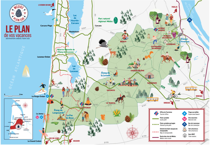 Envie d’un week-end dépaysant à seulement 40 minutes de Bordeaux ? Que vous soyez Bordelais en quête d’idées proches de chez vous ou vacanciers en escale dans la région, le territoire de Médoc plein Sud, situé entre vignes, forêts de pins et plages sauvages, regorge de pépites à explorer en famille. Ici, on peut alterner dégustations dans les châteaux, aventures en pleine nature et baignades dans l’océan. Les distances sont courtes, les activités nombreuses et adaptées aux enfants, et l’ambiance y est simple et authentique : parfait pour une pause nature loin de la ville. On vous propose ici un itinéraire clé-en-main pour un week-end en famille près de Bordeaux, testé et approuvé avec nos enfants !
